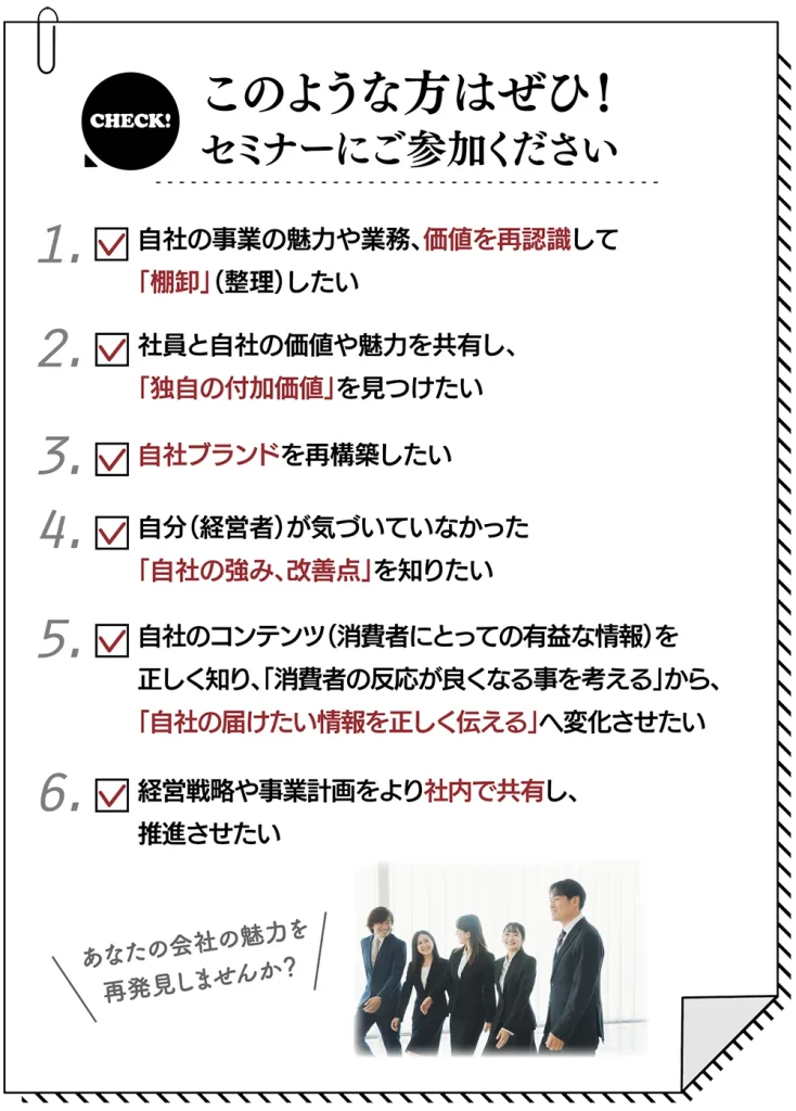 今回のセミナーでは中小企業様を対象に、皆さんのサービスや事業、商品販売戦略等の再設計を行う為に知っていただきたい「自社独自の個性・魅力・価値=インナーブランディング」の説明や、インナーブランディングを社内に浸透、共有、伝える為のお話しを致します。