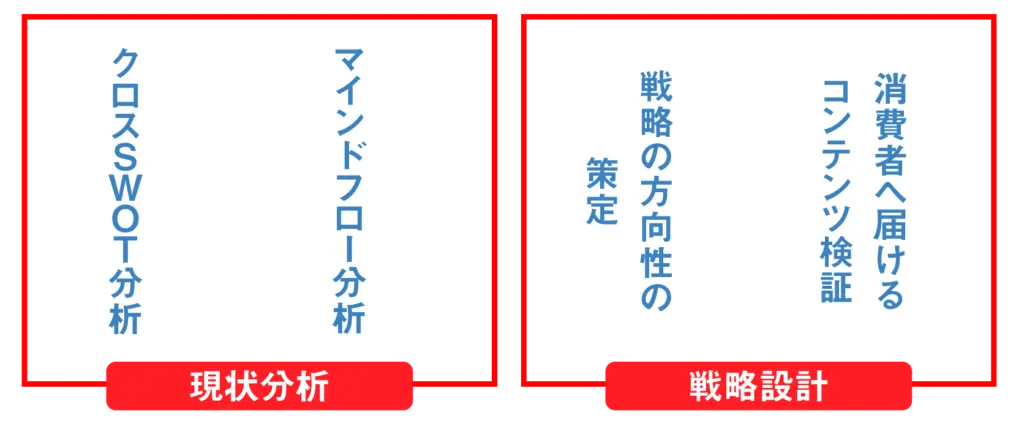現状を把握した上で、「この商品・サービスをなぜ販売し、誰に届けたいのか?」「自社の強みや他社との差別化は?」「消費者のニーズは?」などを私たちと一緒に考え戦略の方向性を定めます。その上で今回の戦略目的と目標を設定します。