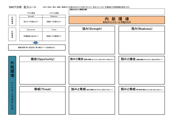 クロスSWOT分析とは、自社にとっての「強み(Strength)、弱み(Weakness)、機会(Opportunity)、脅威(Threat)」を分析し、組み合わせることで市場機会や事業課題に対して「気づき」や「変化」、「指針」を見つけるフレームワークです。